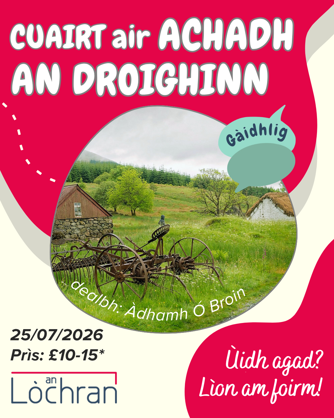 As t-samhradh, thèid sinn mun cuairt air Achadh an Droighinn, taigh-tasgaidh dòigh-bheatha nan Gàidheal faisg air Inbhir Aora. ‘S ann le Àdhamh Ó Broin a tha an tachartas seo. Fastaidh sinn bus agus bidh sinn a’ draibheadh chun na Gàidhealtachd ann an cuideachd Àdhaimh is e ag innse beul-aithris na sgìre dhuinn. Nuair a ruigeas sinn an làrach fhèin, thèid sinn mun cuairt fo stiùireadh Àdhaimh.